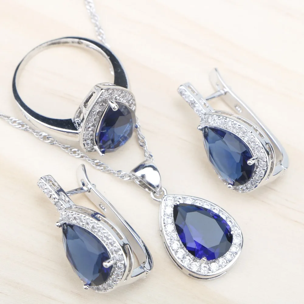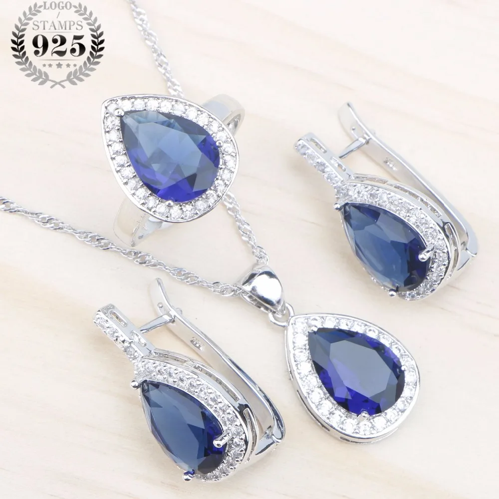 Best Blue Zirconia Silver 925 Costume Jewelry Sets For Women Pendant Necklace Rings Clips Earrings Set V