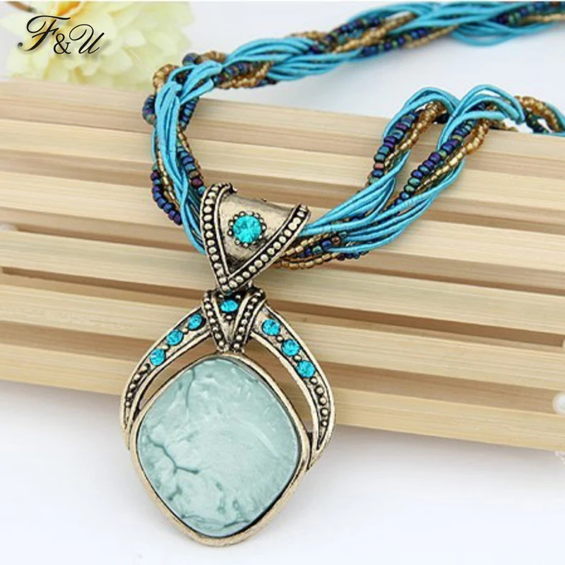 Promo F&U New Bohemian Pendant Necklace Vintage Rhombus Crystal Pendant Bohemia Style Multilayer Chain Ha